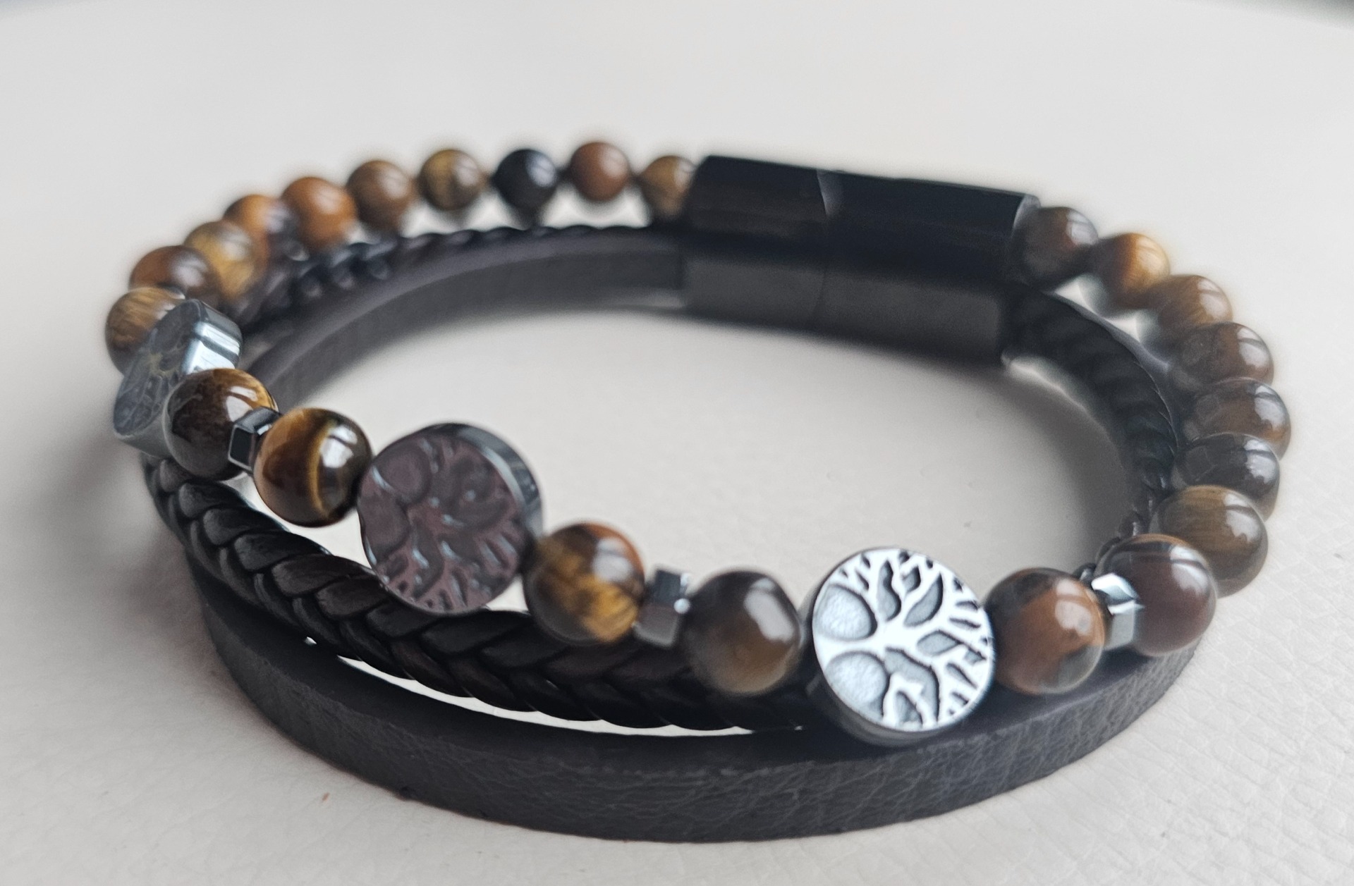 Oeil de tigre + cuir marron foncé + arbre de vie